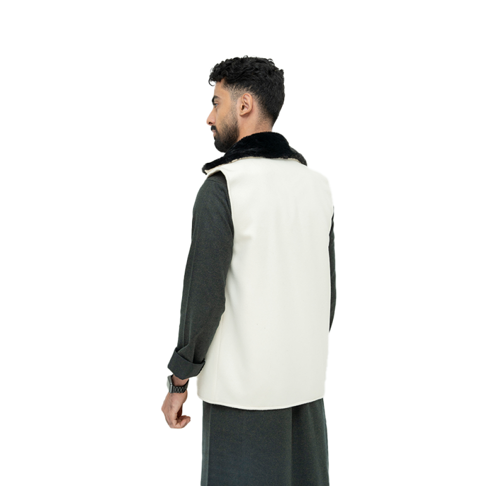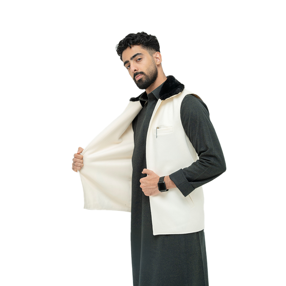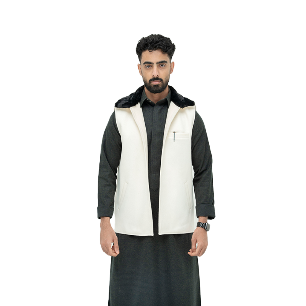 سديري جوخ باللون السكري مكمل ب فرو أسود ، يعطيه أناقة بلمسة مختلفة