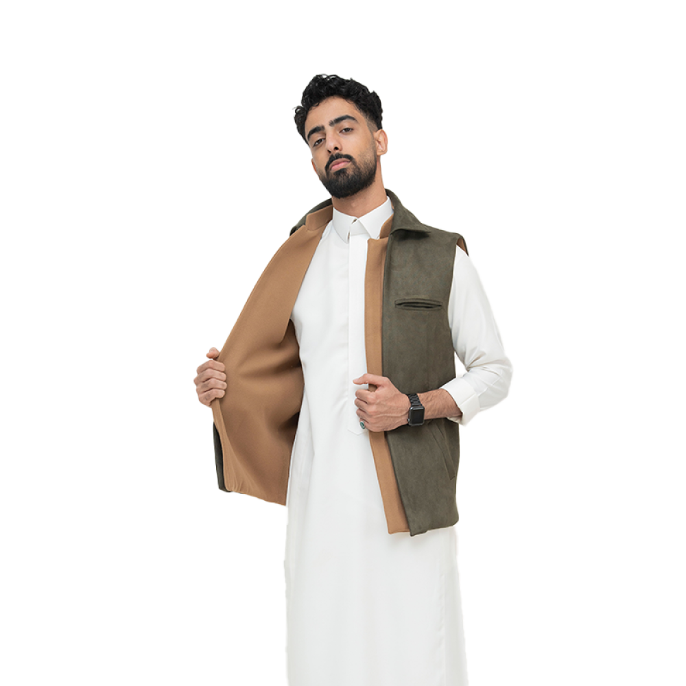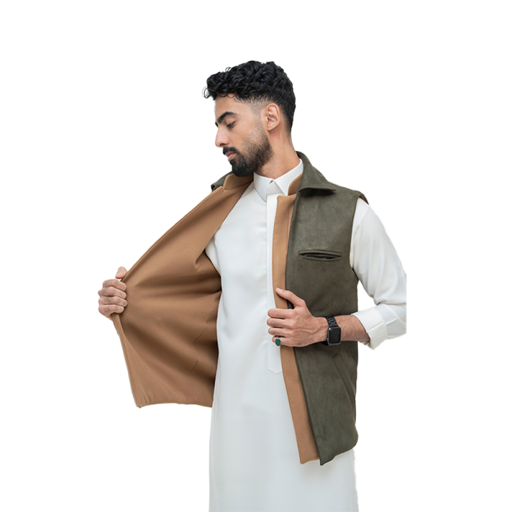 سديري جوخ باللون الزيتي و الجملي ، يعطيه أناقة بلمسة مختلفة