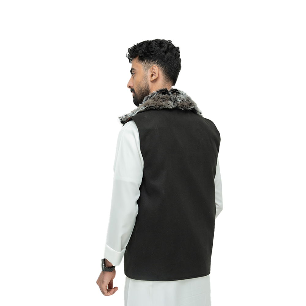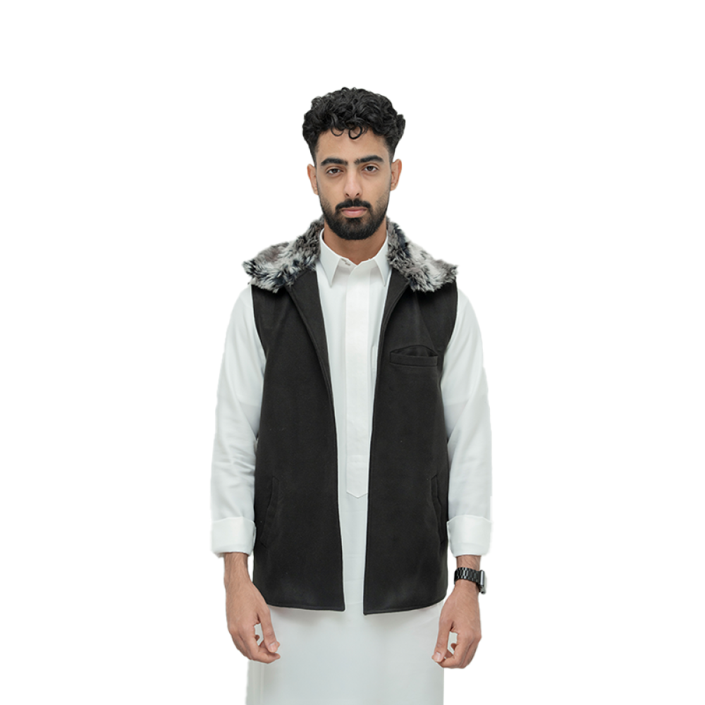 سديري جوخ باللون الأسود مكمل ب فرو رمادي ، يعطيه أناقة بلمسة مختلفة